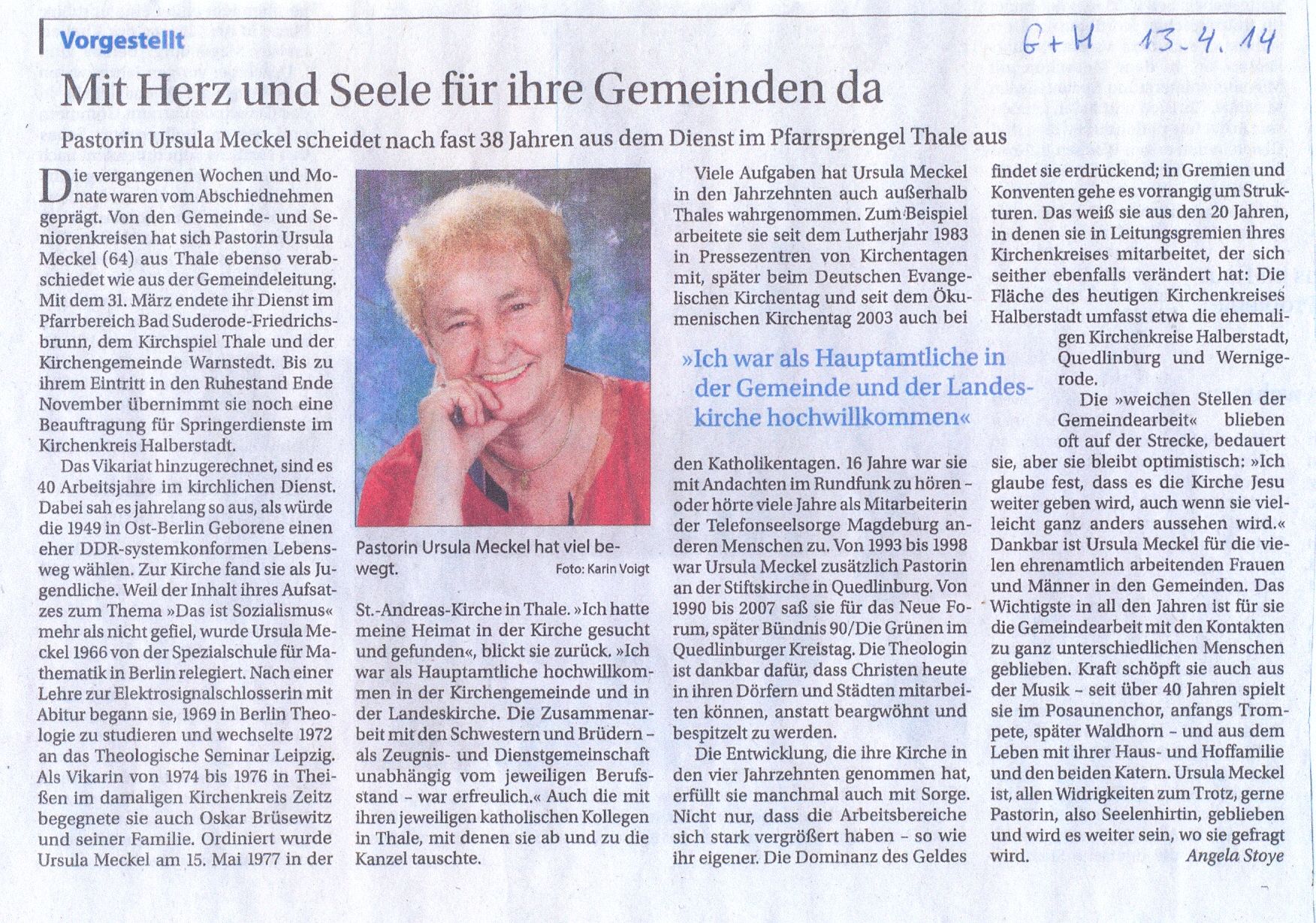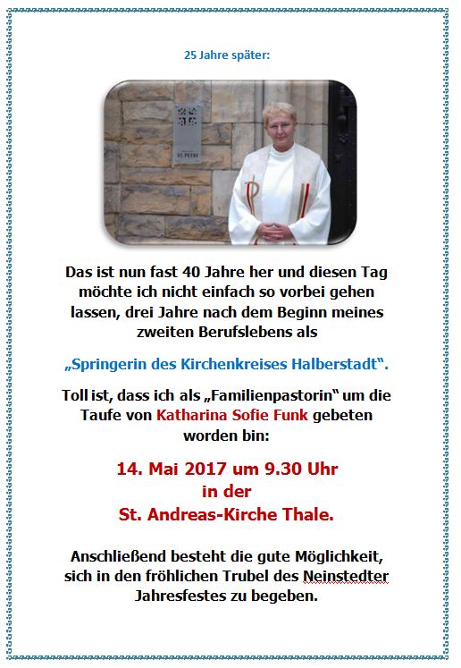 A.: Bisher hast Du das ja ganz geschickt geschafft – denn Dein Dienst im Pfarrbereich Thale endete ja bereits am 31. März – wie Du weißt…