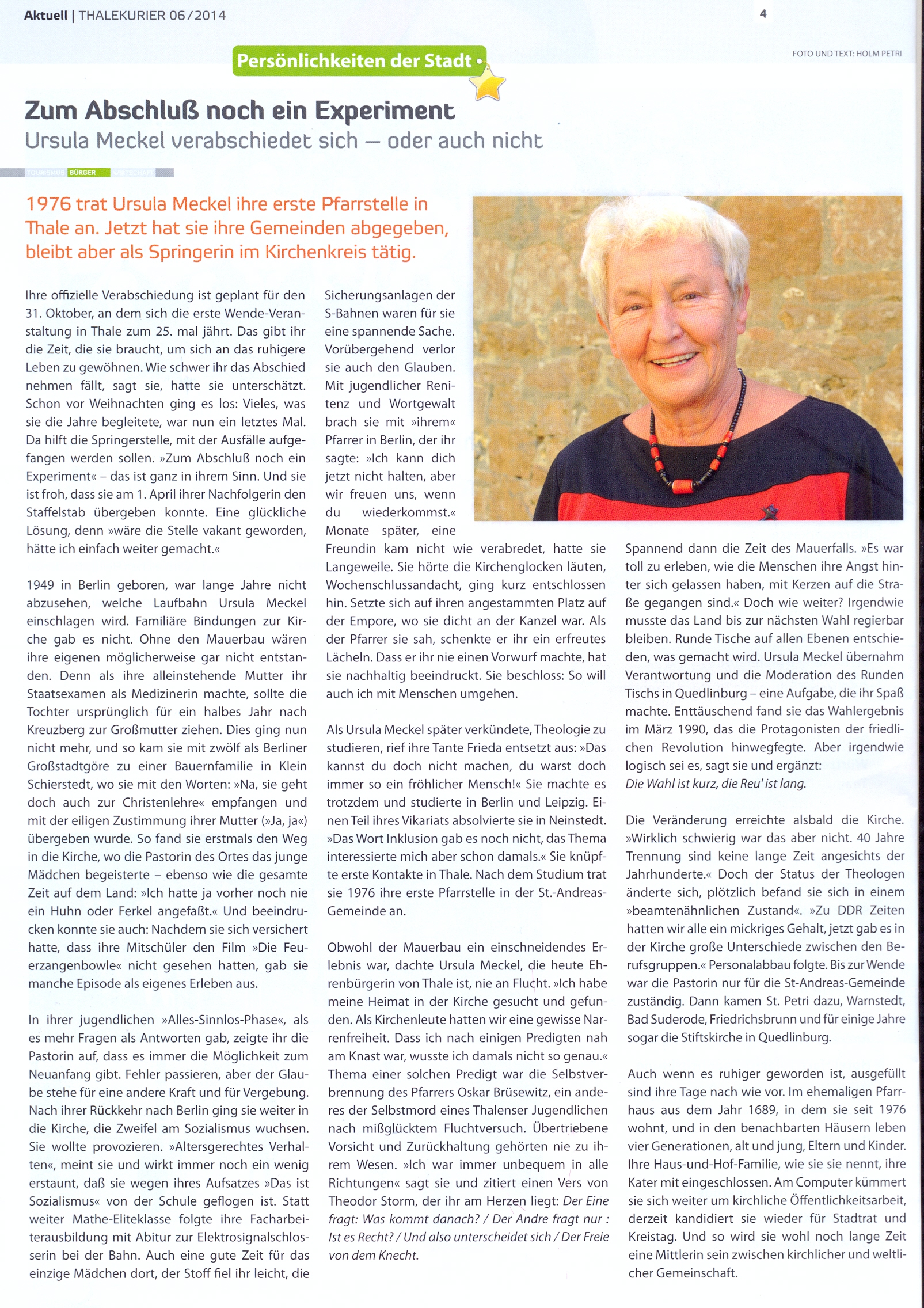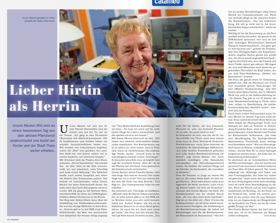 nach 38 Jahren in Thale und 40 Jahren im kirchlichen Dienst wirst Du, liebe Ursula, heute aus diesem Dienst verabschiedet. Dass Du daran lange geknabbert hast, ist kein Geheimnis. Und ja, das ist sicher schwer, nach einer solchen Zeit alles „sein“ zu lassen, was vier Jahrzehnte tagtäglich das Leben und die Zeit prägte, den Tagesrhythmus vorgab, Herz und Verstand beschäftigte: Lektoren und Organistinnen für die Gottesdienste und Amtshandlungen zu finden, die Gemeindebriefe zu gestalten und den Beiträgen „hinterher“ zu laufen, Besuche zu machen, die Anfragen des Kreiskirchenamtes zu bedienen, Gruppen und Kreise zu organisieren und noch viel mehr. Das alles hört nun auf nach 40 Jahren.