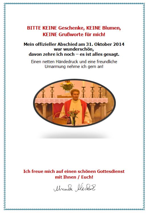 vor Gott und dieser Gemeinde endet hiermit Dein Dienst im Pfarrbereich Thale, der Dir übertragen war. Alle Zuständigkeiten und Pflichten liegen nicht mehr in Deinen Händen. Was Dich in Deiner Arbeit beschwert hat, was unfertig blieb oder Sorgen macht, legen wir in die Hände Gottes, der allein aus allem ein Ganzes zu machen vermag. Nichts soll Dich beschweren, nichts soll Dich betrüben. Gott wird Dich tragen und begleiten auf Deinem weiteren Lebensweg.