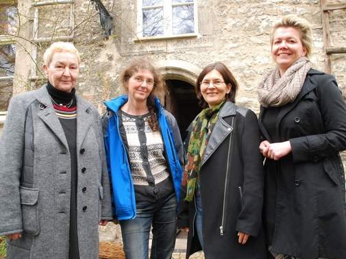 Pastorin im Ruhestand, Ursula Meckel (von links), Ilse-Marie Vogel, Superintendentin Angelika Zädow und die Gemeindekirchenratsvorsitzende von Kroppenstedt, Beate Könnecke, vor dem Pfarrhaus in Kroppenstedt.